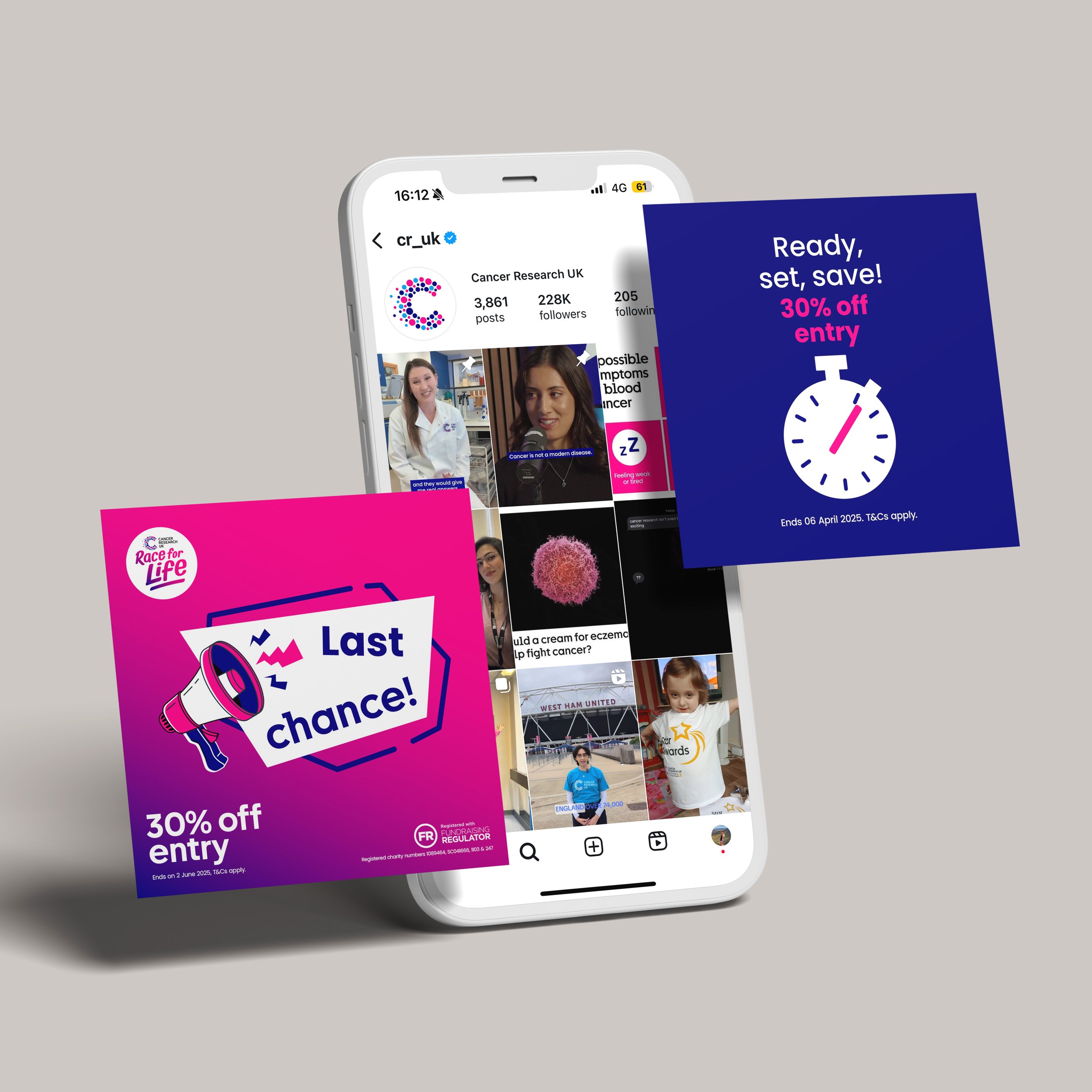I worked on the Race for Life campaign for Cancer Research UK, creating engaging social media visuals to promote upcoming runs and fundraising initiatives. My role included designing cohesive campaign graphics for digital platforms, managing promotional assets across social channels, and utilising Facebook Ads to test and optimise post performance for maximum reach and engagement.