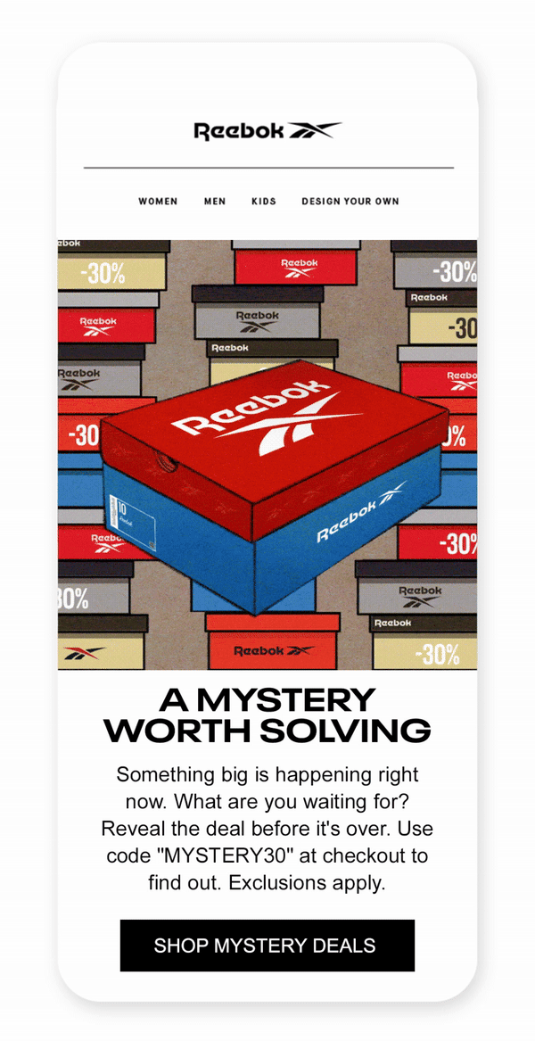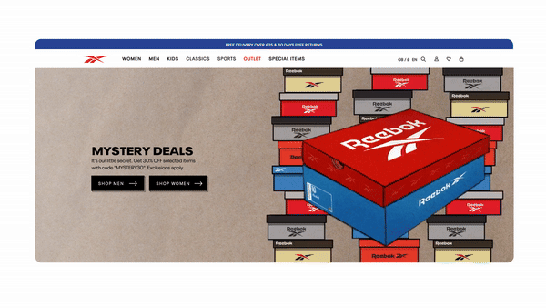 To build excitement around Reebok’s Mystery Deals campaign, I created a dynamic box animation that teased the surprise inside. The concept centered on intrigue — a sealed box that shook, glowed, and pulsed with energy — hinting at the exclusive offers waiting to be revealed.